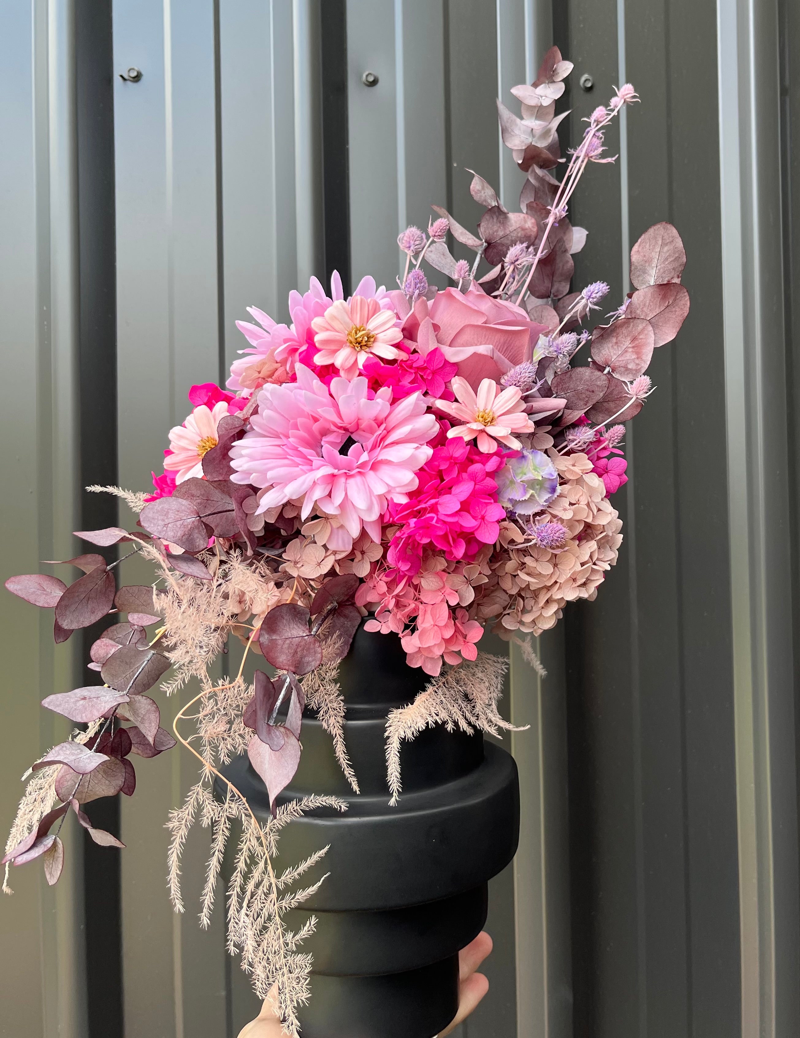 We have used a variety of dried, silk and preserved flowers, foliage and textural elements to create a one of a kind pot arrangement for long lasting enjoyment.